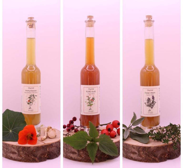 Oxymel, auch Sauerhonig genannt, ist eine Mischung aus Essig und Honig, deren Anwendung bis in die Antike zurückreicht. Verfeinert mit regionalen Kräutern gibt´s verschiedene Geschmacksrichtungen im Angebot, mit denen du gesunde und stärkende Wildkräuter-Limo herstellen oder dein Salatdressing aufpeppen kannst.